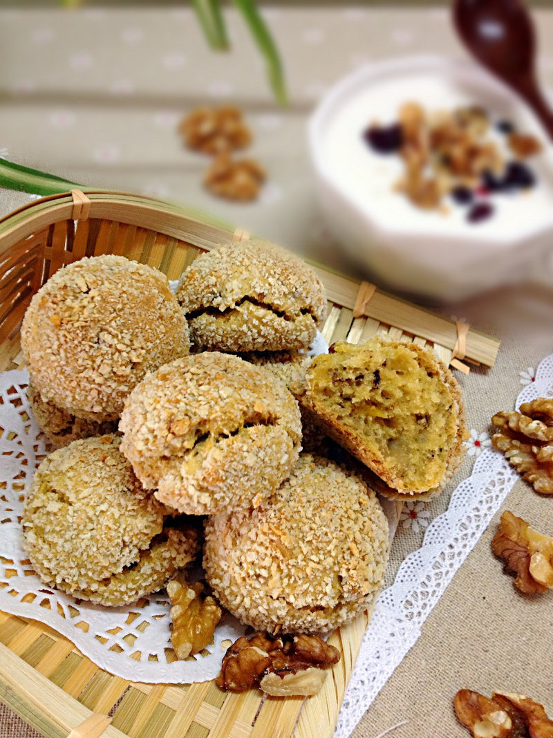 红薯泥150克;低筋面粉170克;核桃仁40克;