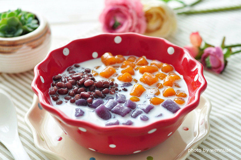 芋头1个;大红豆200克;木薯粉250克;红豆夹心珍珠150克;牛奶250ml;红番薯1个;