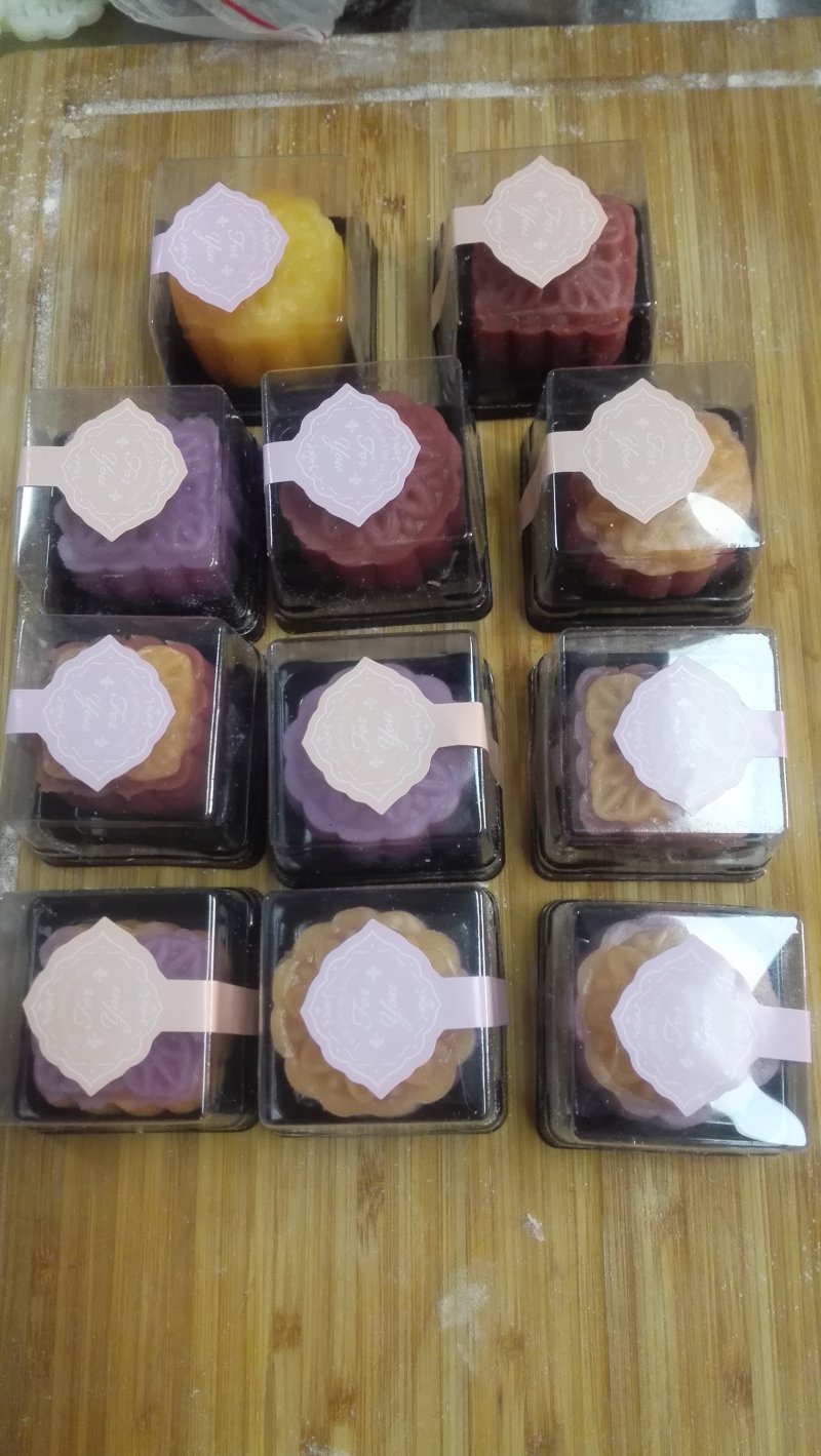 7:把成型的冰皮月饼包装好,并在盒底部放上干燥剂。封口,并贴上标签。装盒就完成了。