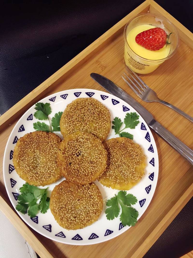 7:盆中放些芝麻。启子压成圆饼状正反两边粘上白芝麻,南瓜泥中间我放了红豆沙,但是忘记拍照了,呜呜...