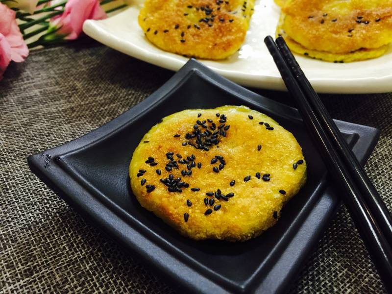 11:锅中倒油,油要多一些,烧热后将南瓜饼放入,中小火煎至两面金黄便可以开吃了。