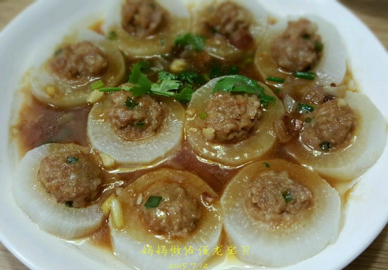 8:出锅倒出汁备用,炒锅放入少许油,爆香干葱,姜茸、蒜茸,放入刚才倒出的汁,放入一勺生抽,水淀粉,蚝油勾芡,淋入白萝卜酿碎肉面上,最后撒上葱花及芫荽点缀。如能吃辣,爆香红辣椒圈撒至面上会很养眼!大功告成,可以上桌吃喽!谢谢大家收看!