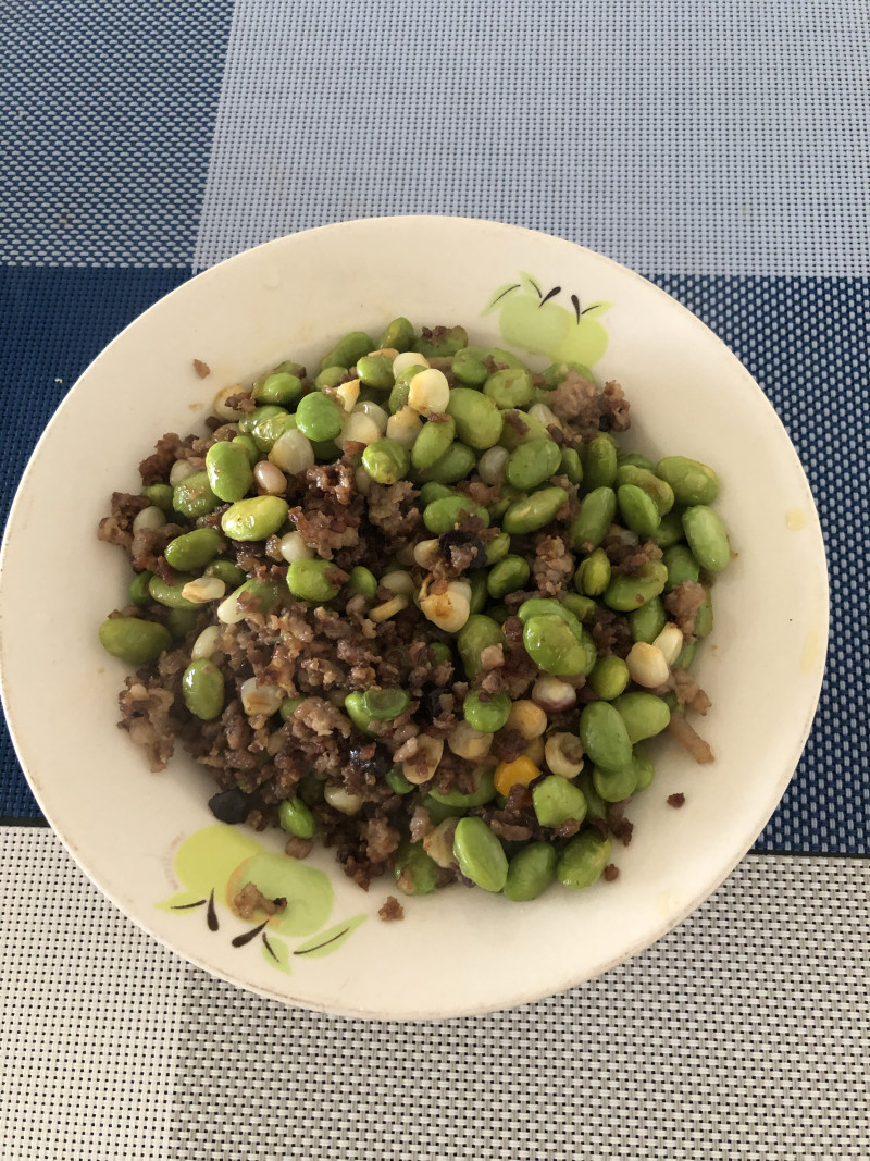 2:倒入青豆和玉米粒翻炒,加入一勺开水,盖上锅盖焖3分钟,让青豆从外面到里面成熟。