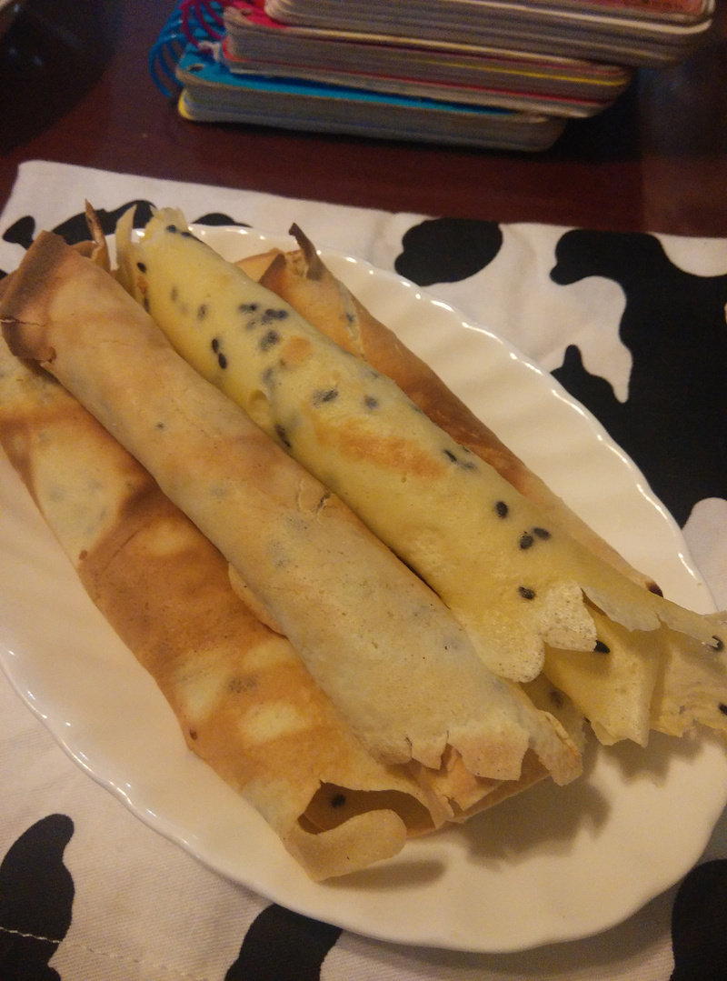 平日喜欢小蛋卷,一般只做模具中央紫荆花大小的圆片。喜欢长卷的,多加点面糊,摊满模具,做出来的就是长卷了。