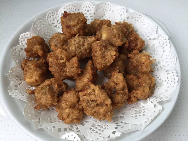 4:挤成直径3厘米的丸子,140-150℃炸5分钟,180-185℃复炸2-3分钟上色即可。