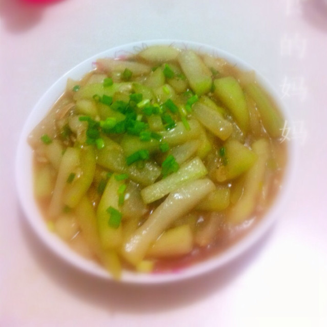 1:窝瓜一段。去籽儿、去皮,切成薄片。再切点葱花。