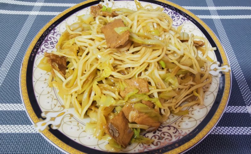 7:7、菜炒熟后,将蒸好的卤面条倒入,菜面搅拌均匀即可。