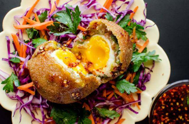 3:在裹好的鸡蛋外面滚上一层面包屑。