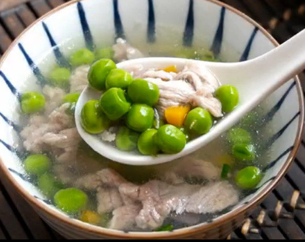 2:锅里加入适量水,倒入豌豆,胡萝卜粒姜丝,加入适量盐,油大火烧开转小火煮两分钟,加入瘦肉划散煮两分钟。