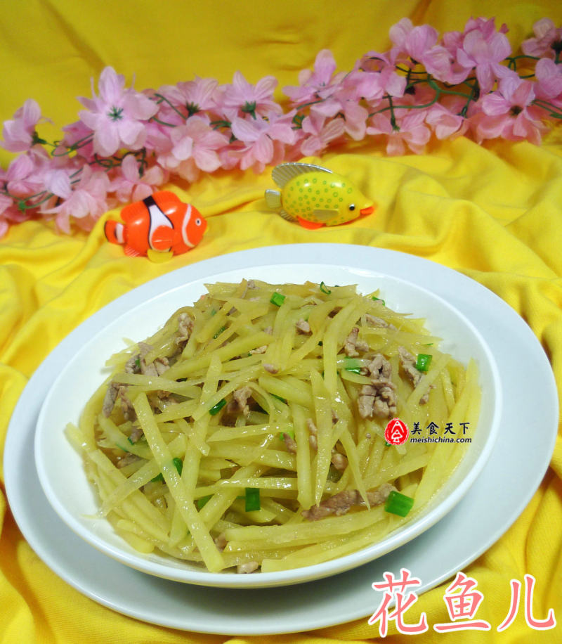 1:食材:土豆(已洗净去皮)、瘦肉(已切成丝)、葱花