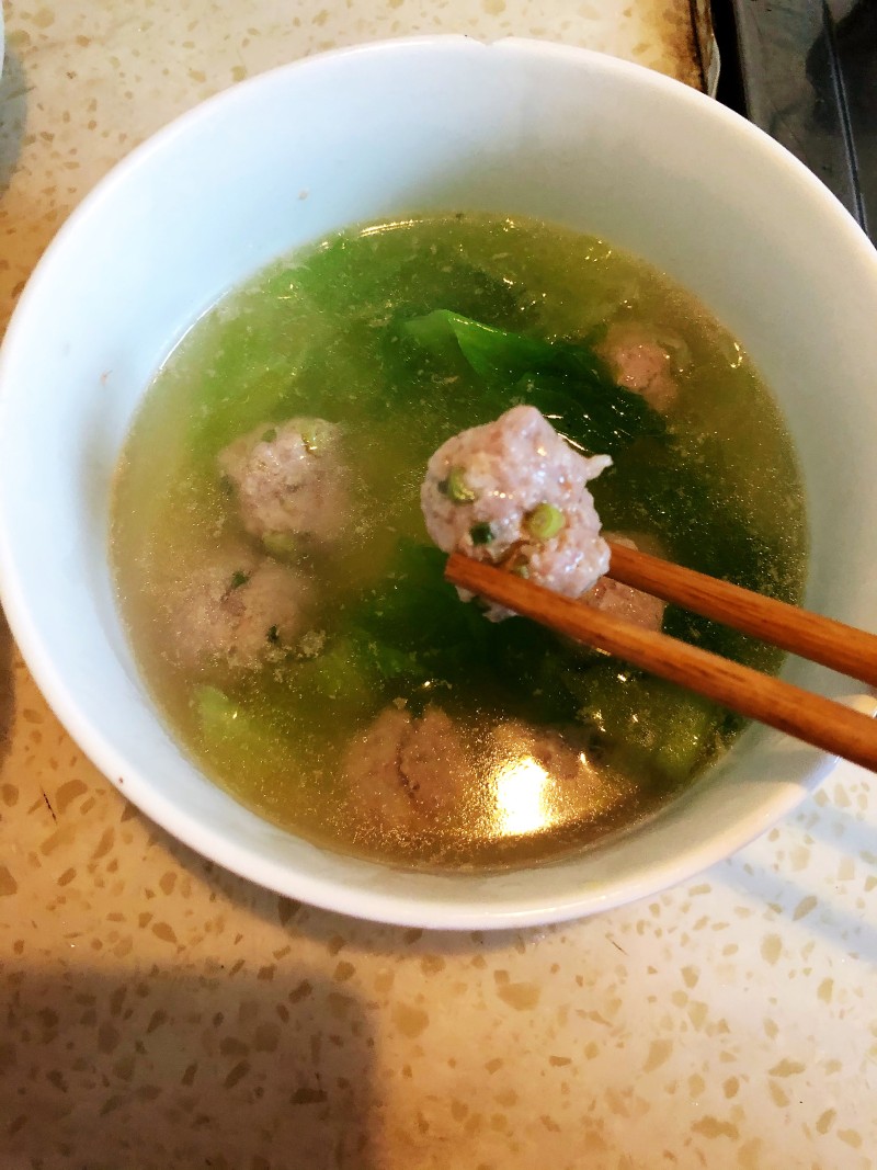 4:肉丸子煮熟浮起来以后,放入切好的生菜叶。