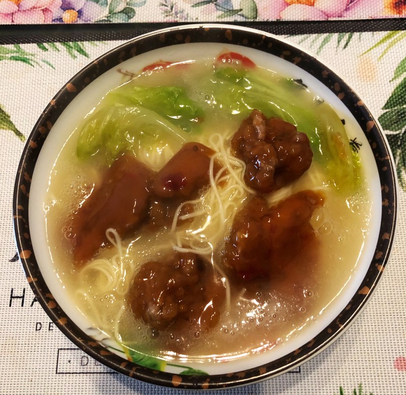 5:等肉团定型后,放入面条煮3分钟,中间要加入冷水,避免面条糊锅。