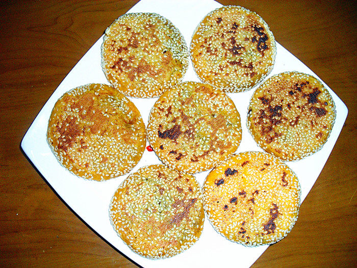 10:轻轻按扁成饼状,稍做整理表面沾少许黑芝麻。