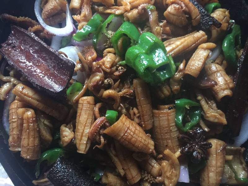5:铁板加油烧热,倒入鱿鱼煎熟;