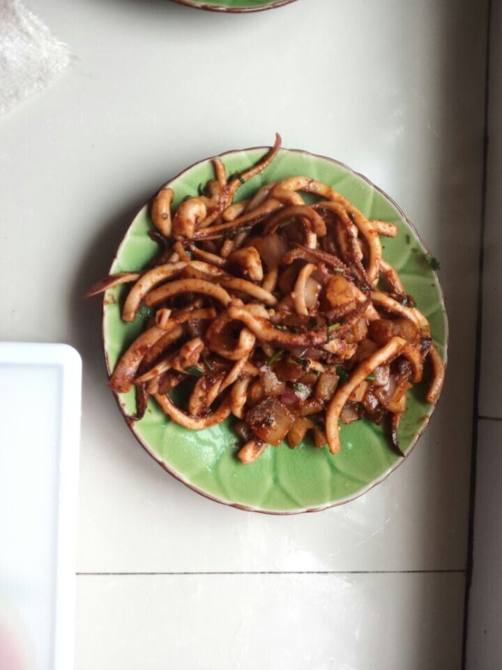 7:下入鱿鱼,翻炒,隔20秒左右翻炒一下,大约3分钟~5分钟。(由于大小不一样)