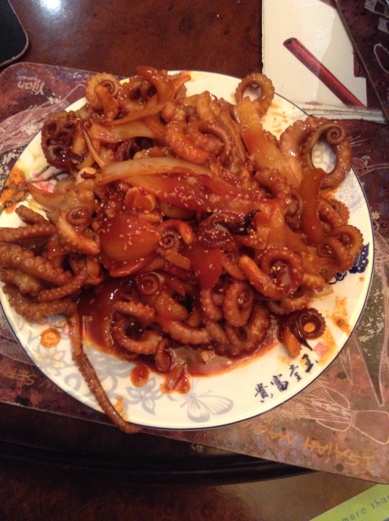 7:将炒好的鱿鱼放在洋葱上面,一道美味的铁板鱿鱼就做好了