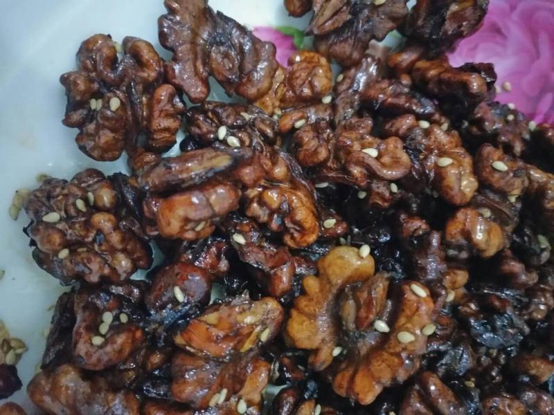 4:黑糖融化后,放进去煮过的核桃,水干后出锅。