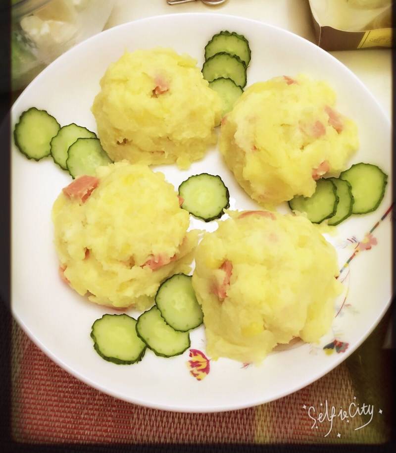 4:将拌好的土豆泥用勺子弄成球状装盘,切少量黄瓜片点缀。