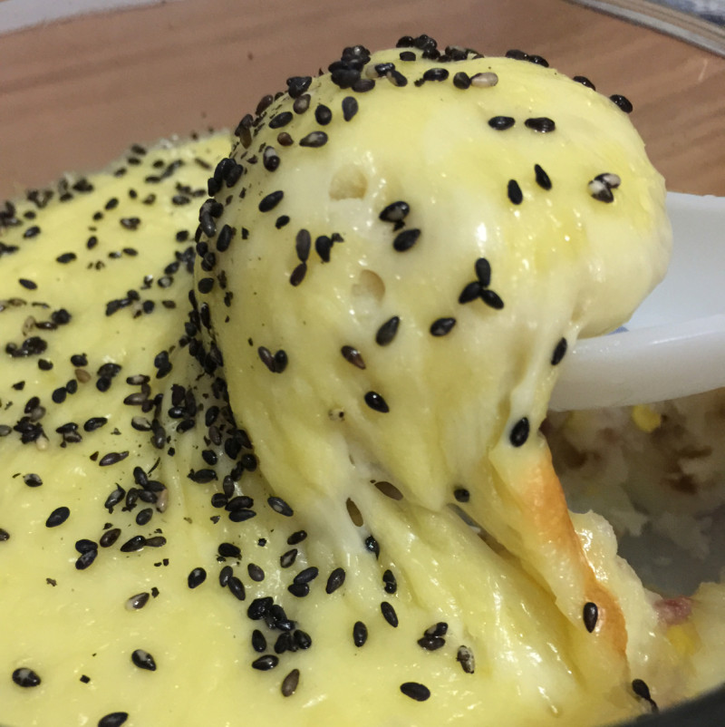 7:将烤箱预热170度,烤5分钟,至奶酪融化,表面撒少许黑芝麻。