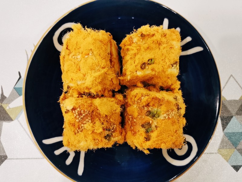 肉松适量;葱花适量;白芝麻适量;沙拉酱适量;白醋几滴;
