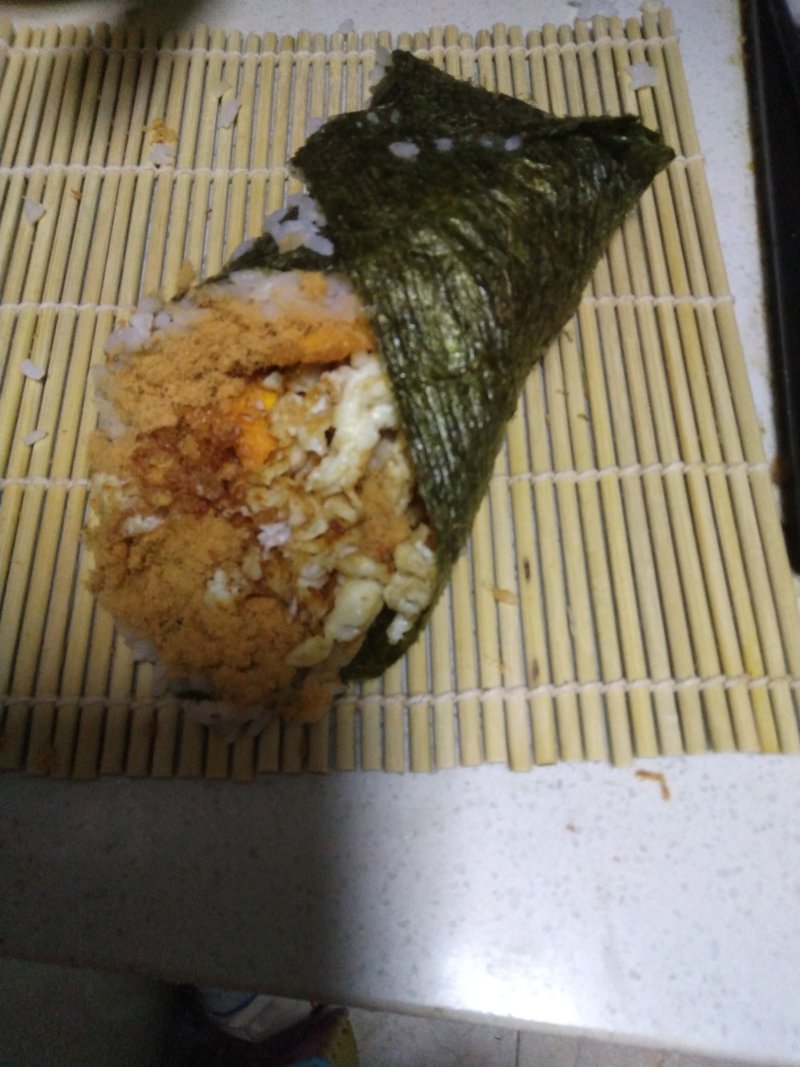 鸡蛋3个;海苔肉松适量;熟黑芝麻适量;