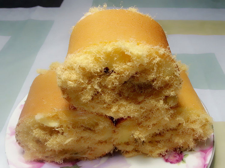 6:做蛋卷的蛋清打发至湿性发泡(中性发泡)即可,即打发的时间相对短些,搅起蛋清,尖角呈弯状,而不必像一般蛋糕那样需要尖角直立。