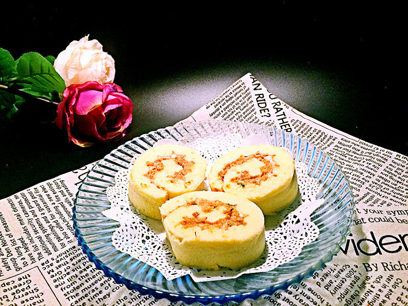15:铺上肉松。 卷起来,用油纸包好,冰箱冷藏定型后切件。