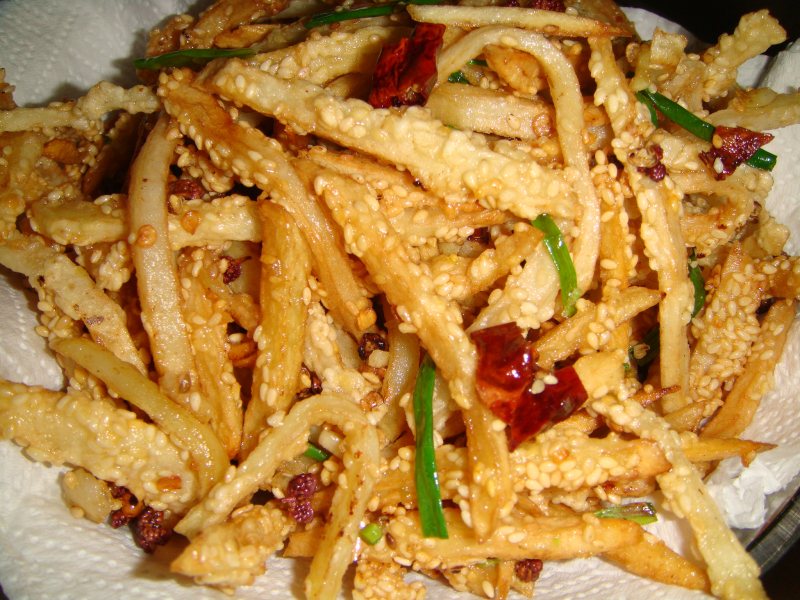 8:倒入炸好的土豆丝,迅速搅拌,撒入适量黑芝麻拌匀即可。关火