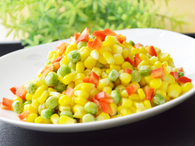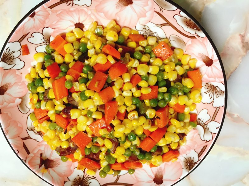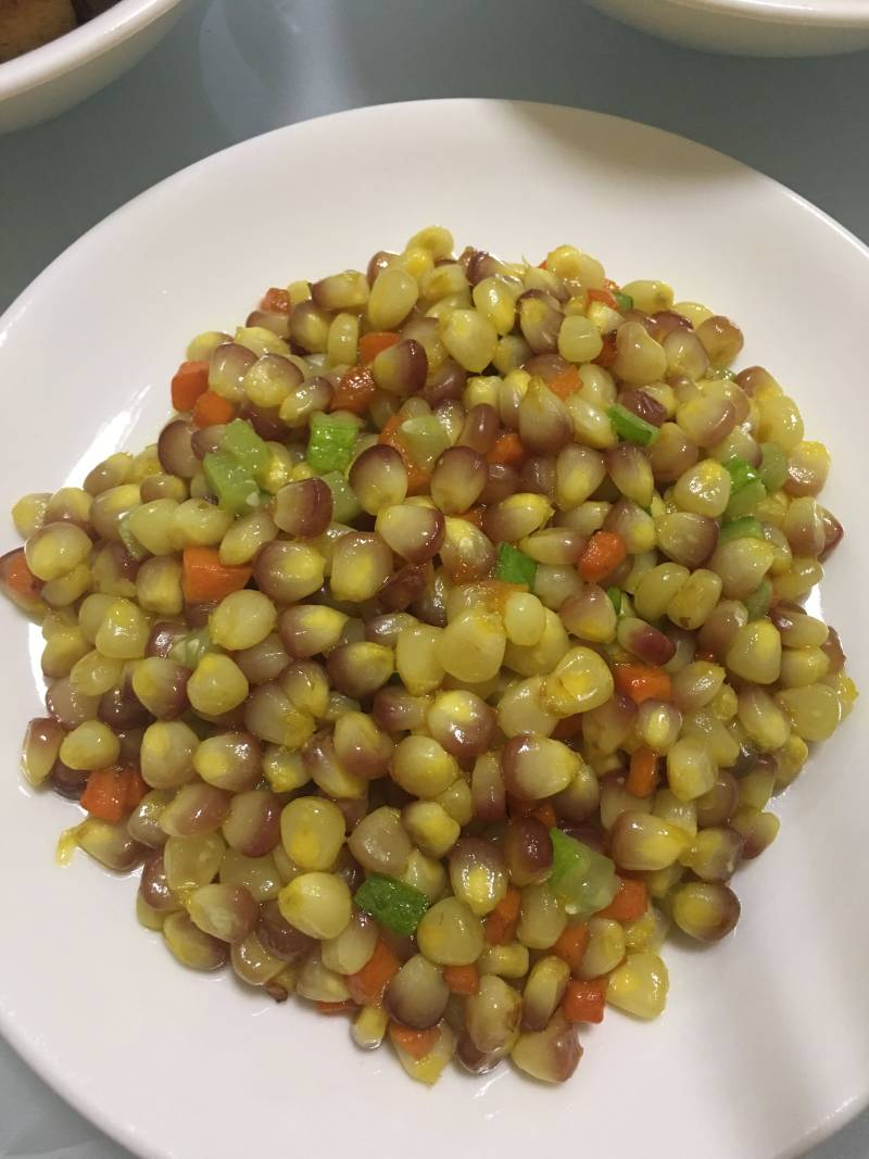 4:加入红萝卜、玉米粒,盐炒一分钟