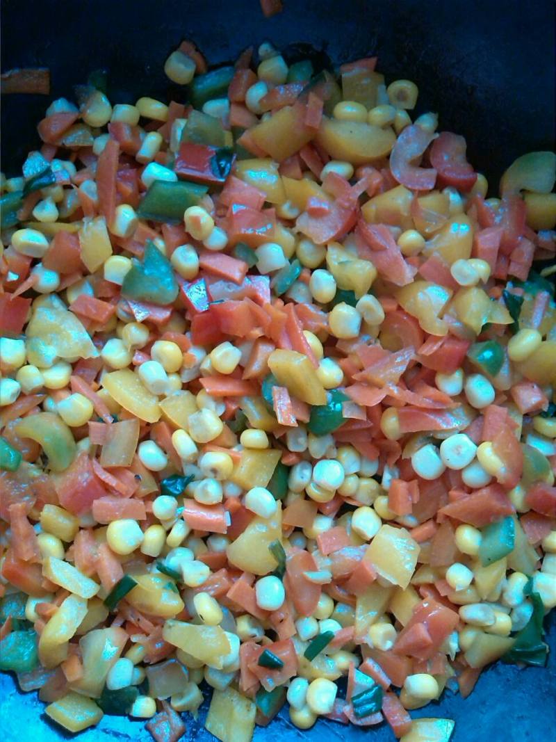 3:把玉米粒,红椒青椒方腿炒透加姜汁水倒入玉米粒盐翻炒
