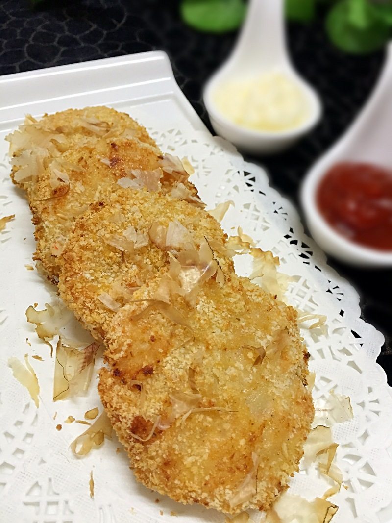 油适量;盐适量;料酒适量;生抽适量;胡椒粉适量;木鱼花适量;鸡蛋1个;面粉适量;面包糠适量;
