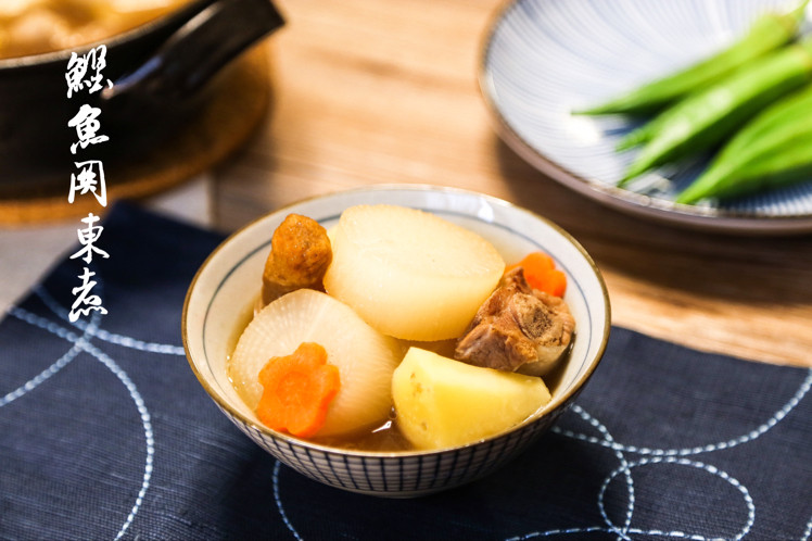 6:过滤干净,加入味琳,淡口酱油,下萝卜,胡萝卜炖煮30~40分钟后,加入魔芋,丸子之类食材,熟后继续在汤汁中浸泡约1小时,就完成喽。肉食动物,可以加排骨和排骨汤,萝卜会更香