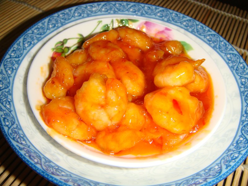 7:倒入虾仁快速的裹上甜辣酱。