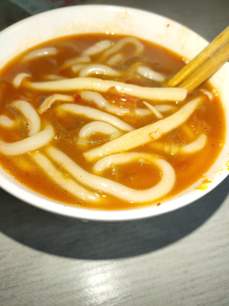 7:用刚才炒香料的锅把土豆粉煮软,用筷子搅散。