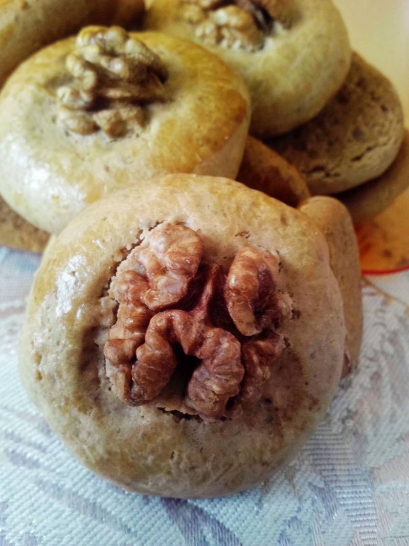 7:做成小圆饼,刷上剩余蛋液,每块压上一小块生核桃仁,再刷一层蛋液