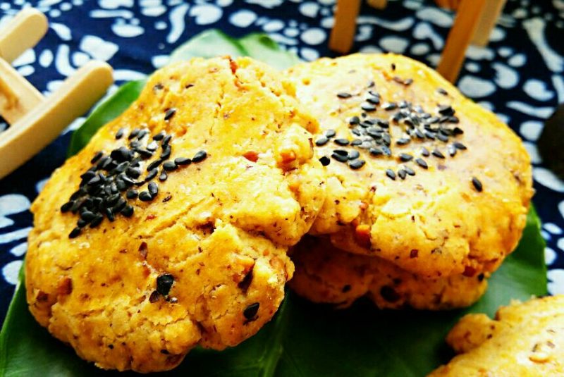 7:全部压扁后撒上黑芝麻,送进上下火175度预热好的烤箱中层烤制20分钟