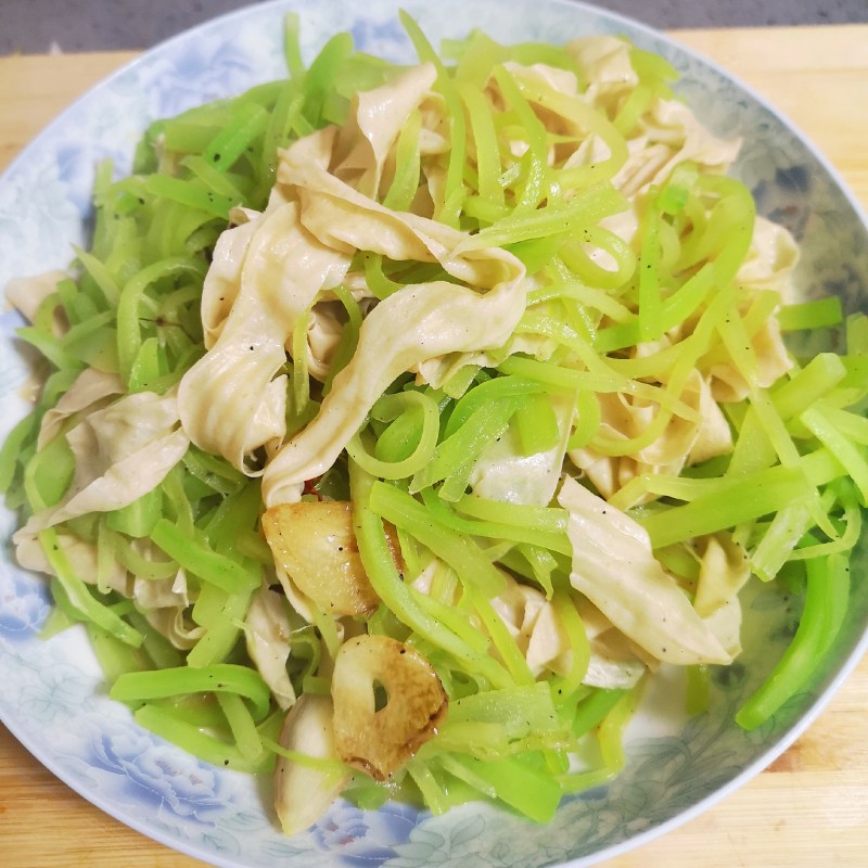1:青笋切丝,干油豆腐皮冷水泡软。蒜切片。
