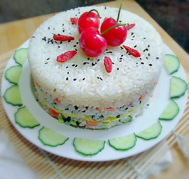 10:把事先摊好的鸡蛋饼放到海苔米饭上,最后倒入黄瓜香肠米饭,压实!
