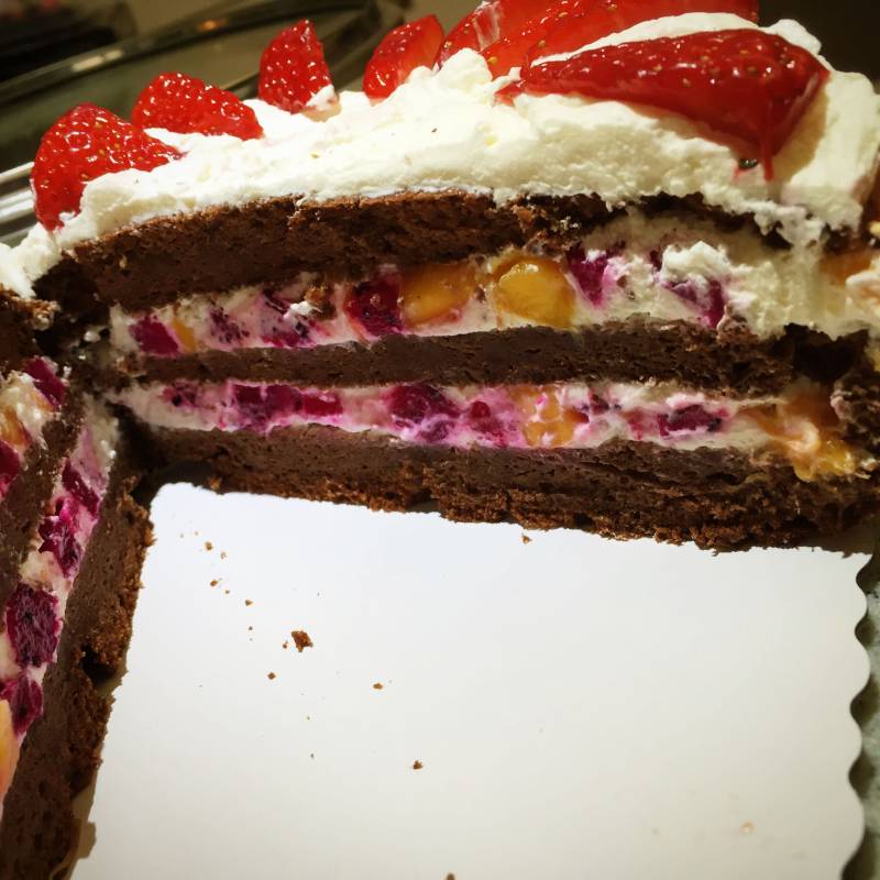 4:蛋糕烤好后冷却备用。用刀把蛋糕分三层,打发好奶油。每一层蛋糕坯涂上奶油加入水果丁。