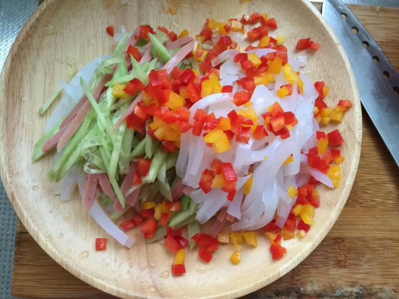 红椒一个;大蒜末一头;黄瓜一根;黄椒一个;凉粉半块钱;方型火腿适量;葱末一小段;
