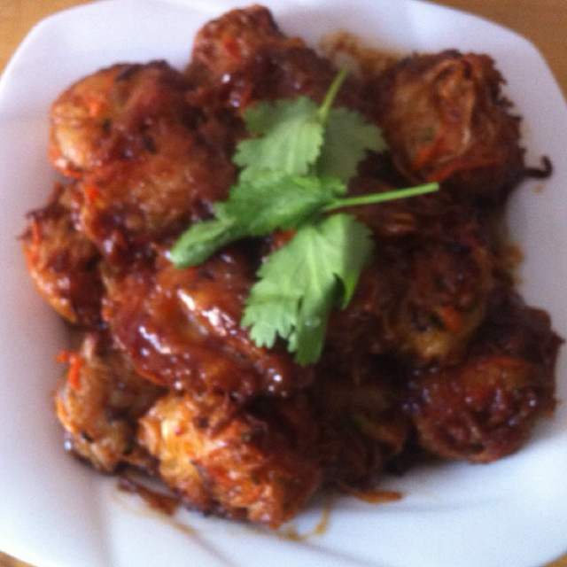 6:油锅烧热,将丸子团好下锅,中火炸透。