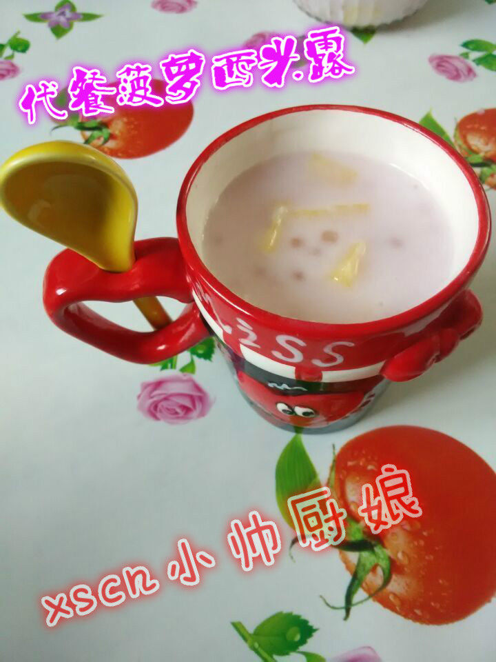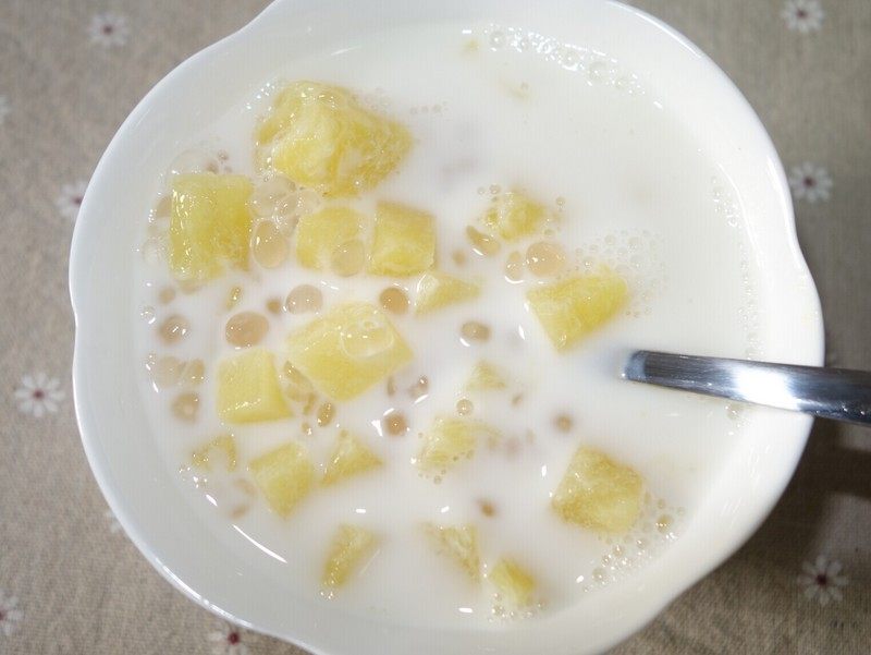 注:1.菠萝果肉先用盐水泡过的,可以放心使用。2.西米过凉开水后会Q弹些哟……天热时,凉开水里加点冰块,西米会更Q更弹的……3.冰糖和牛奶的量,看自己口味调整吧。3.冷藏之后更好喝哟……