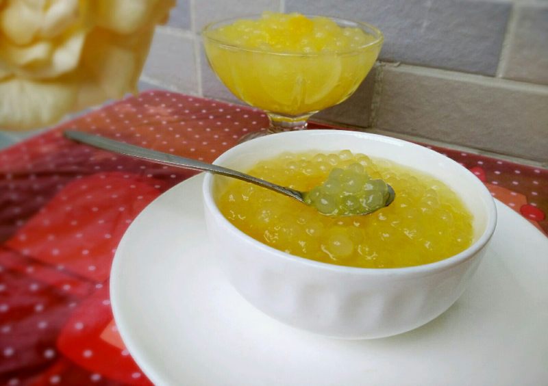 11:剩余一半西米加入,柠檬杨梅汁、杨梅果酱、放黄桃粒装饰。小清新的西米露就做好了。
