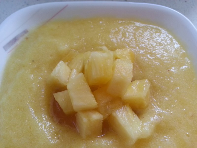 4:把菠萝汁倒在西米上,用菠萝块点缀,即可。