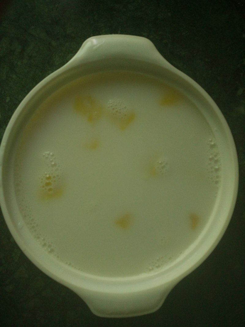 6:将菠萝糖水倒入装西米的碗中。加入牛奶,搅拌均匀。