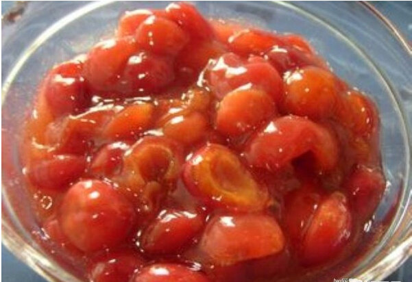 7:7,把煮好的樱桃汁倒入樱桃里拌匀,酸甜可口的樱桃酱就做成了。