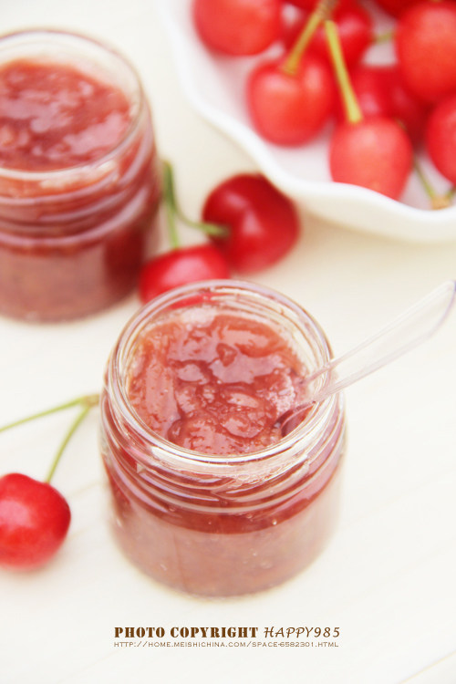 8:事先冼净烫过的瓶子准备好,趁热将樱桃酱装入瓶中,倒立,利用樱桃酱的热度将盖子消毒,并使瓶中处于真空状态