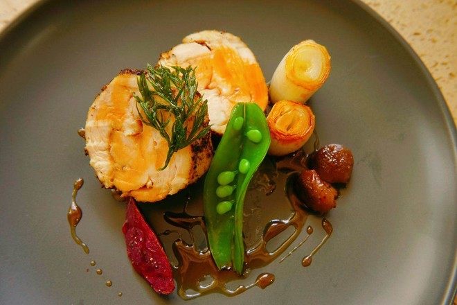 注意:1、鸡肉对开腌制咸度把握好,时间15分钟。2、卷鸡肉卷的时候刀切面朝外。卷的时候要卷实,不能太松。3、蒸鸡肉卷要小火20分钟。4、煎配料和煎鸡肉卷时间、颜色要把握好。5、装盘根据实际情况变化。