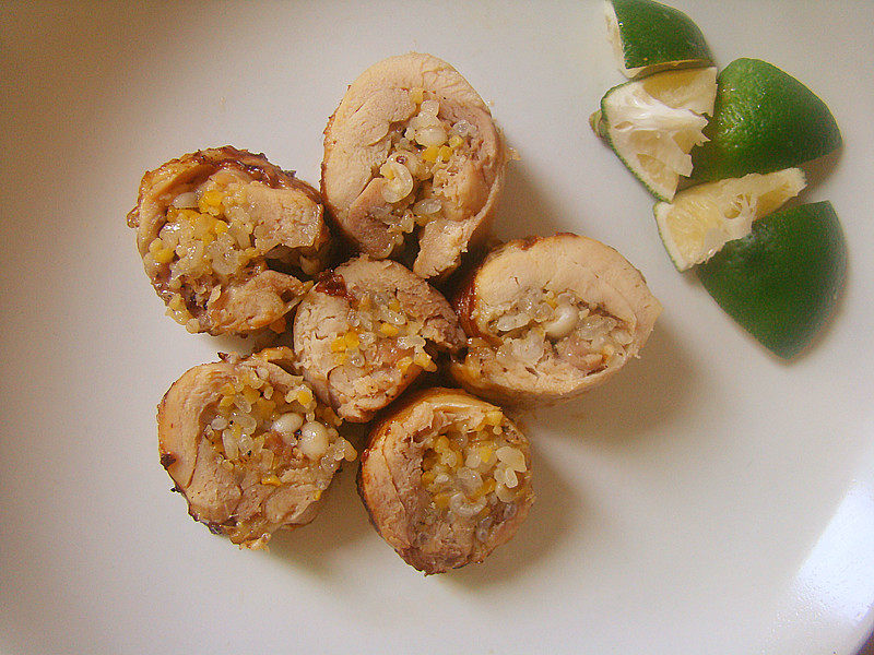 6:接着把线用水打湿,将包好粗粮的鸡腿缠起来,一定要裹的稍微紧致一点,切的时候才不容易松散。
