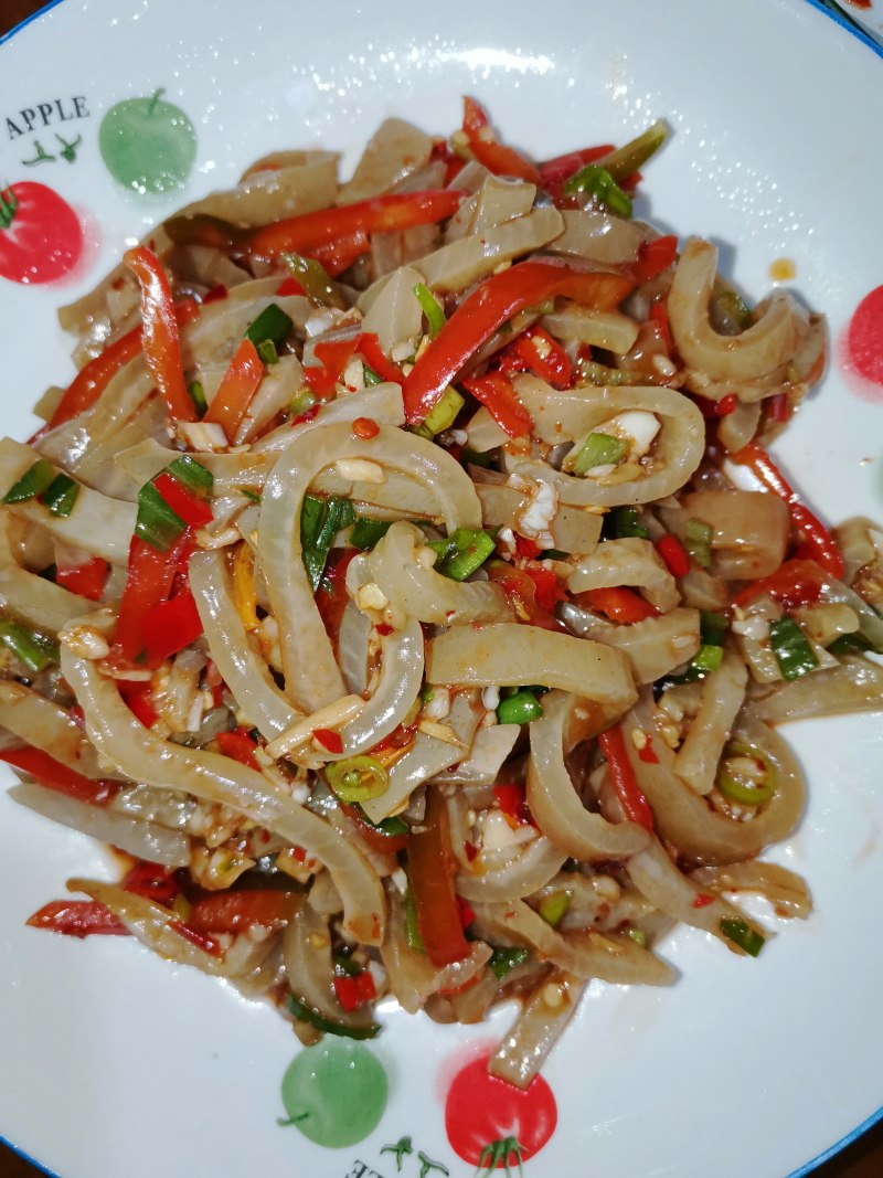 1:肉皮买来后,用清水泡两个小时,凉水下锅,放料酒姜葱。焯水透凉,倒掉锅里的水,换新水,把肉皮上的油脂刮掉。去掉毛。放进水中放料酒葱姜大料香叶草果桂皮煮一个小时肉皮软烂。捞出放凉。切小条。